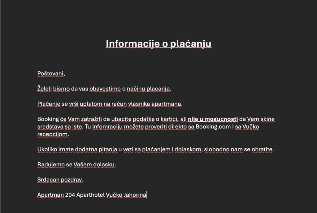 The staff at Apartman 204 Aparthotel Vučko Jahorina private host speak multiple languages, including English, Croatian and Serbian.
